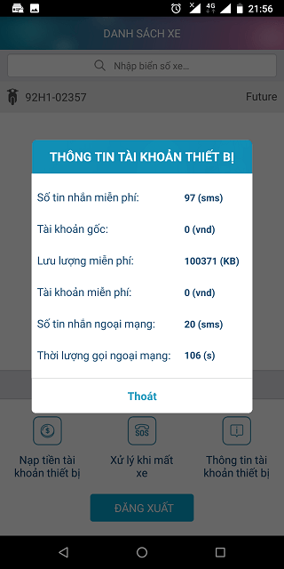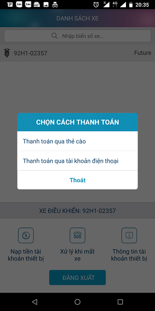 Chương trình cung cấp chức năng nạp tiền cho sim gắn trên thiết bị từ thẻ cào, hoặc tài khoản của số điện thoại điều khiển xe. Để sử dụng tính năng này, người dùng bấm vào biểu tượng “Nạp tiền tài khoản thiết bị”. Người dùng nhập mã thẻ cào và ấn nút “Xác nhận” để tiến hành nạp tiền cho tài khoản sim gắn trên thiết bị.
