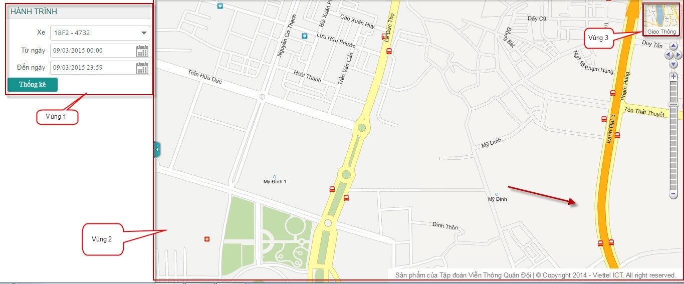 Vào menu chức năng Hành trình. Hệ thống chuyển tới màn hình xem lại hành trình gồm 3 vùng chính:
