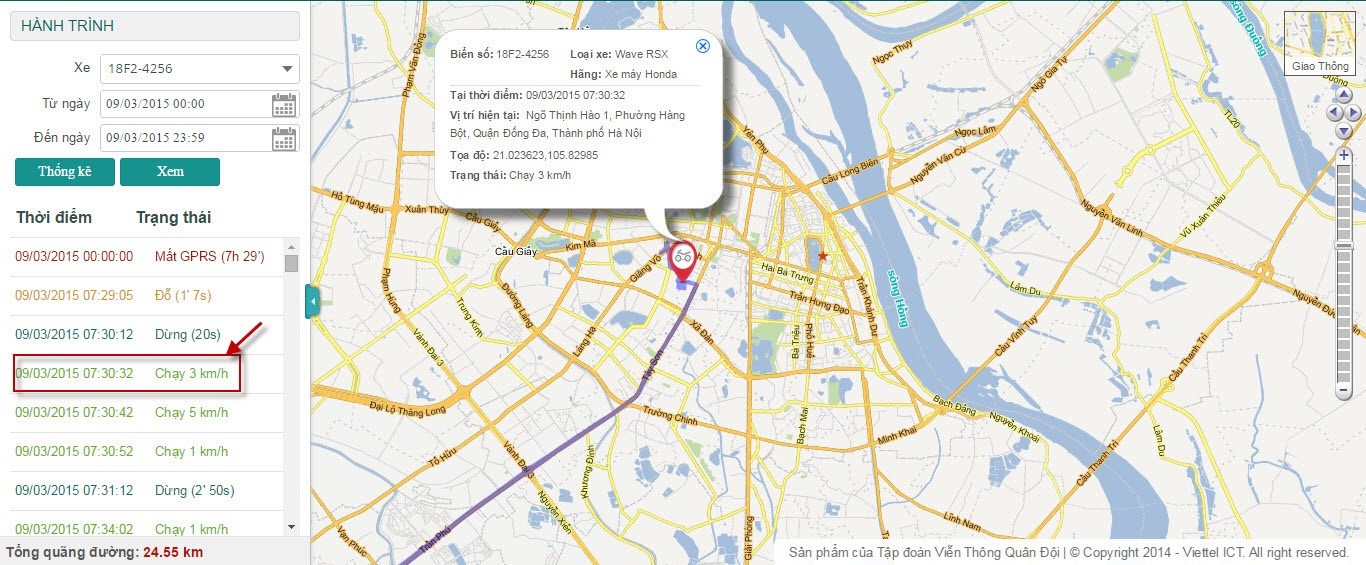 Sau đó bấm nút “Thống kê” để kiểm tra và hiển thị các thông tin về hành trình xe. Nếu có dữ liệu về hành trình xe, bảng điều khiển sẽ xuất hiện danh sách dữ liệu về trạng thái xe tại từng thời điểm và đồng thời trên bản đồ số sẽ vẽ lại lộ trình xe.